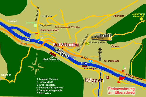Anfahrt von Dresden über die A17 bis Abfahrt Pirna, weiter in Richtung Bad Schandau. Sie kommen direkt auf die B172 und fahren weiter über Königstein auf der B172 bis Bad Schandau. Am Ortseingang von Bad Schandau vor der Elbbrücke biegen Sie rechts ab in Richtung Krippen. Am Ortseingang an der steilen Rechtskurve fahren Sie ab von der Hauptstraße gerade über eine kleine Brücke und kommen an ein Stoppschild. Sie fahren weiter geradeaus diese Straße, auf der rechten Seite vor dem Gasthaus "Ziegelscheune" befinden sich unsere Ferienwohnungen. |